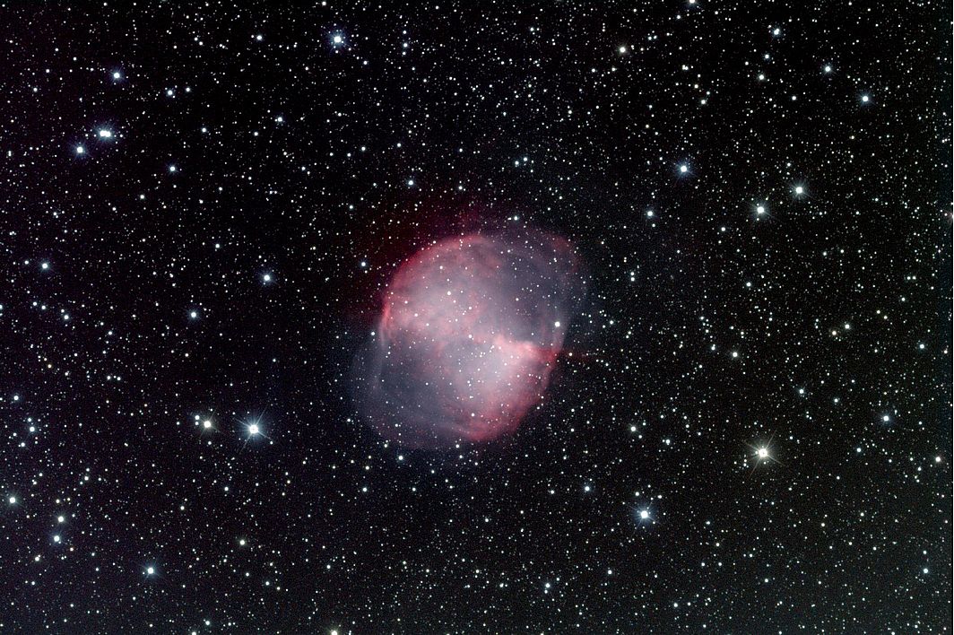 Der große Hantelnebel (Messier 27) ist ein planetarischer Nebel im Sternbild Füchschen in einer Entfernung von etwa 1360 Lichtjahren. Es war der erste planetarische Nebel den Charles Messier 1764 entdeckte. Planetarische Nebel sind die Überreste sterbender Sterne mit Massen kleiner als der doppelten Sonnenmasse. Wenn am Ende des Sternlebens der Wasserstoff im Innern verbraucht ist, hört die Kernfusion auf und die Sternhülle wird in der Folge in den Weltraum abgestoßen. Sie bildet eine leuchtende Blase aus Gas um den verbliebenen weißen Zwerg im Zentrum. Aller Wahrscheinlichkeit nach wird unsere Sonne in etwa 5 Milliarden Jahren ebenfalls als planetarischer Nebel und weißer Zwerg enden.